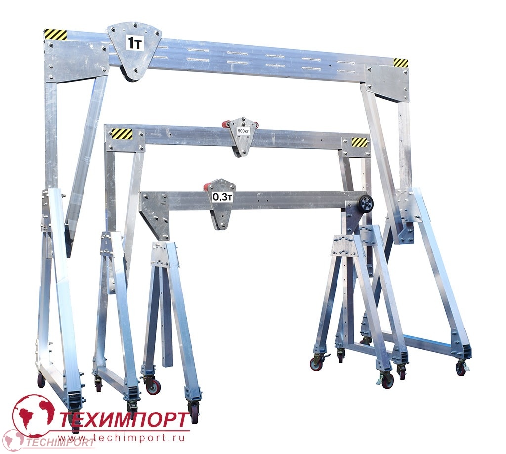 Light aluminium gantry crane manufactured by ZAO Techimport. Due to usage of light aluminium gantry and rotating wheels of a bigger diameter, this crane has an excellent manoeuvrability and mobility in warehouse territory.