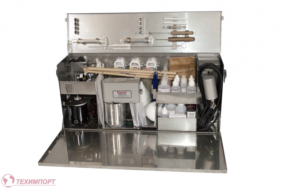 В комплект входят реометр, реторта, мешалка для полевых испытаний, фильтр-пресс половинной площади, набор для определения содержания песка, pH бумажные индикаторы, реактивы и посуда для выполнения анализов на определение хлоридов, щелочности и жесткости воды